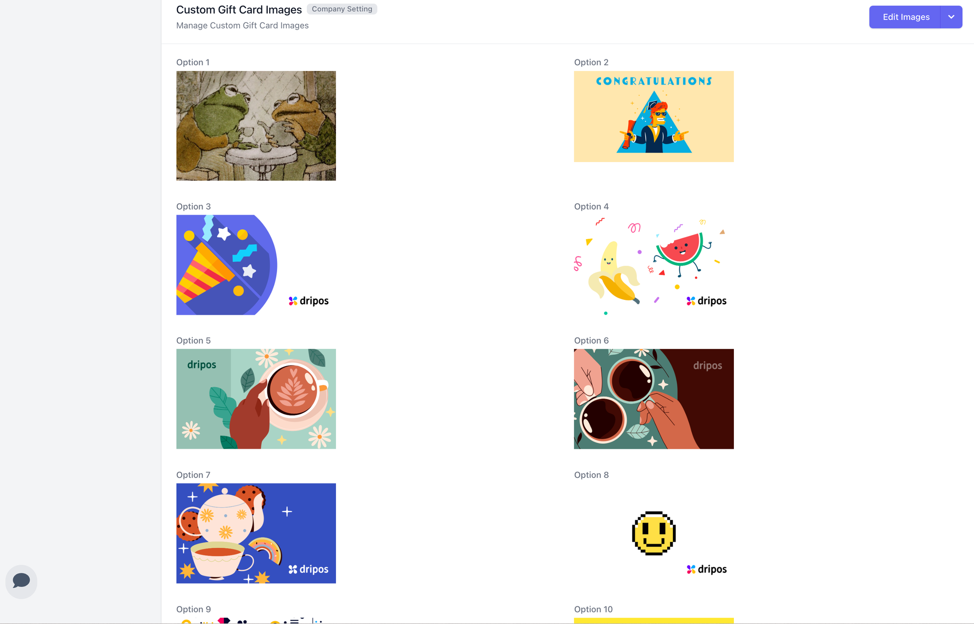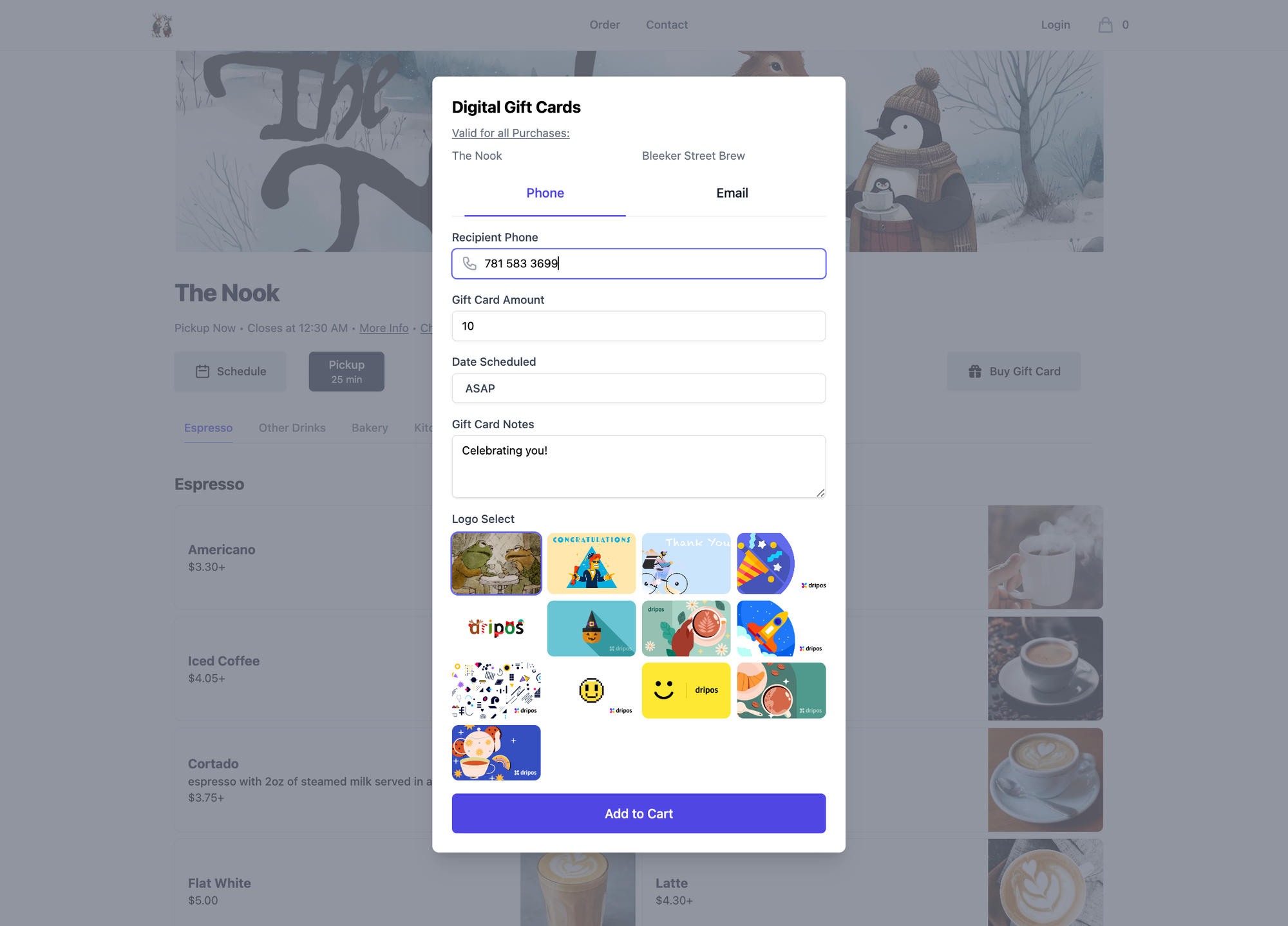Generic gift cards work, but customized ones leave a lasting impression. Adding your shop's colors, logo, or a unique design makes the card feel special and helps customers feel more connected to your brand. Digital gift cards make customization simple. You can create different designs for birthdays, holidays, or any special occasion, all without needing to order large quantities. Dripos offers a range of digital gift card designs, and if none fit your brand, you can easily upload your own. This flexibility ensures your gift cards reflect the uniqueness of your coffee shop, making every gift card feel special and tailored to your brand.